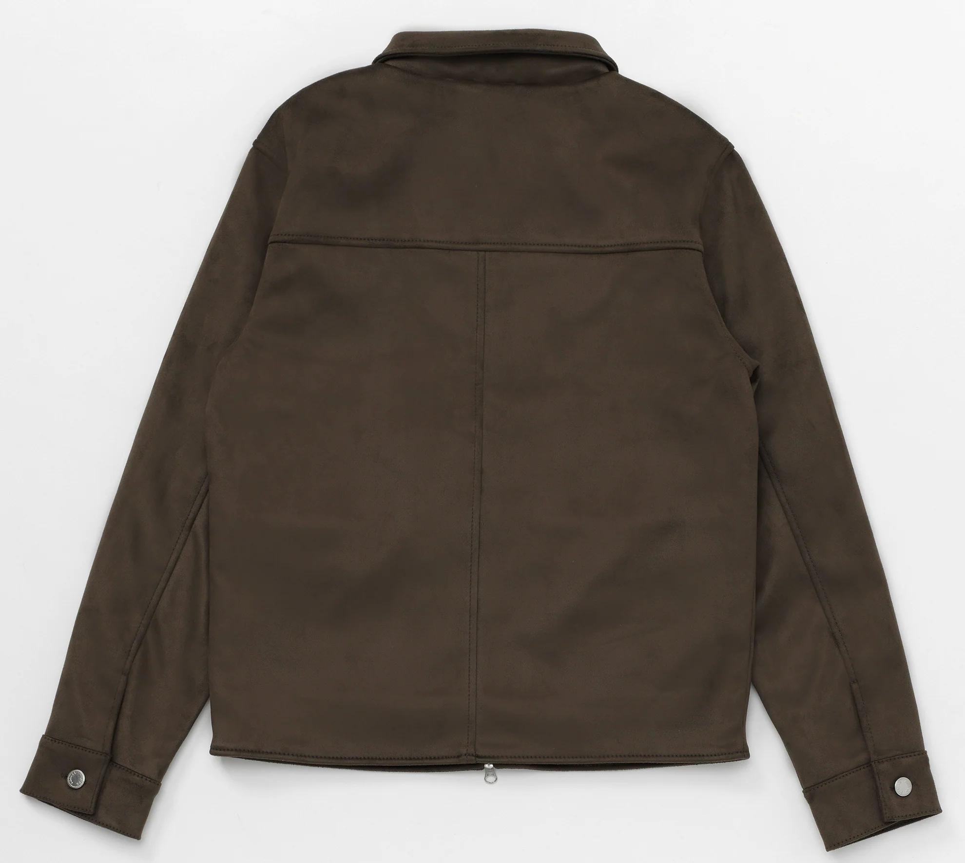 Vegan suede jacket with way ykk zippers. Navy satin lining and two outside flap pockets.